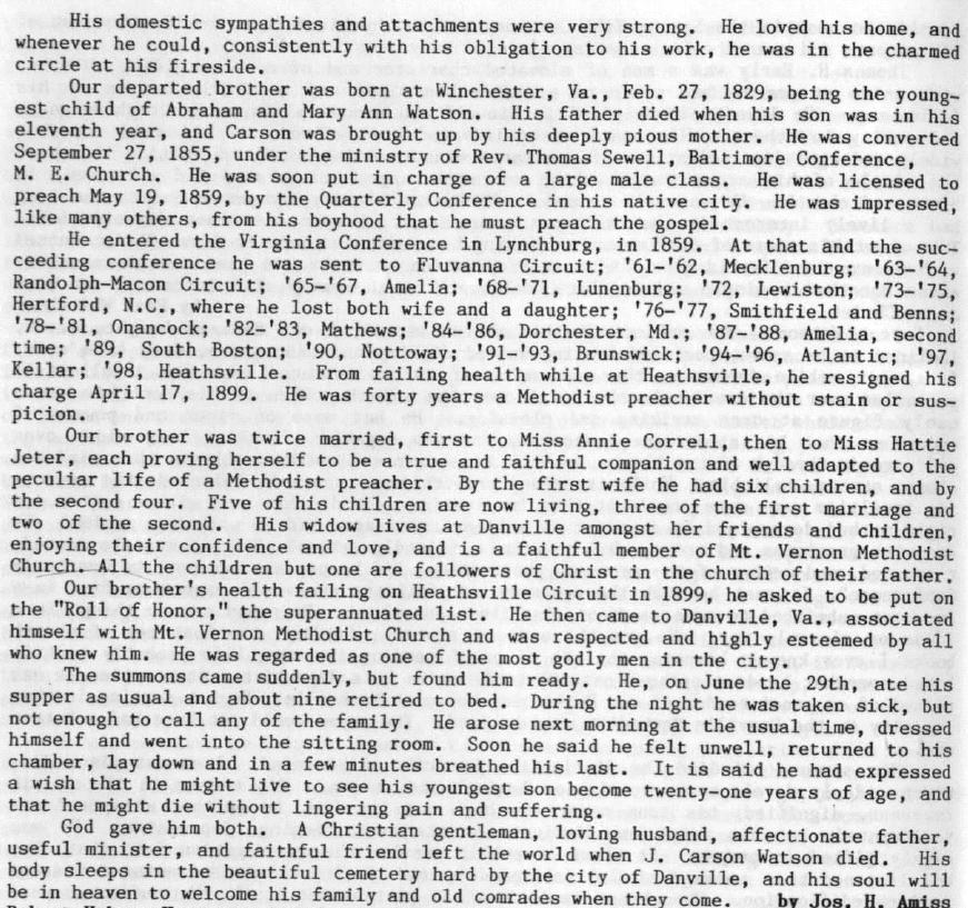 Reverend JAMES CARSON WATSON born Winchester, Va., Feb. 27, 1829; died Danville, Va., June 30, 1904; Methodist preacher, 1859-1904; first wife died in 1876 [unnamed] and he then married Hattie Jeter; died June 30, 1904; had several children.